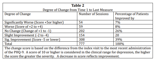 Table 2 data from several clinics in which mental health professionals routinely used the PHQ-9 to obtain patient reported outcomes on depressive symptoms. Without case mix or session data it is difficult to compare it to “baseline” data, but the degree of change appears to reflect outcomes below what might be expected for common outpatient therapy. Thus, data can serve as means to explore the interventions and alternatives that can improve care.
